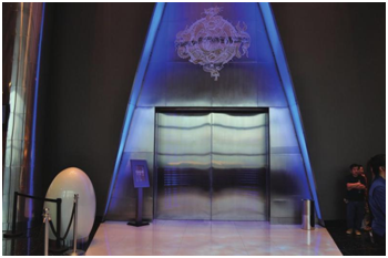 圖 電梯廳,背景來源當(dāng)代藝術(shù)家岳敏君名作——《金字塔》。一群光頭老頭排列整齊,重復(fù)的夸張笑臉讓給人一種嬉笑張揚的美,為空曠的廊道帶來凌冽的藝術(shù)氣息。